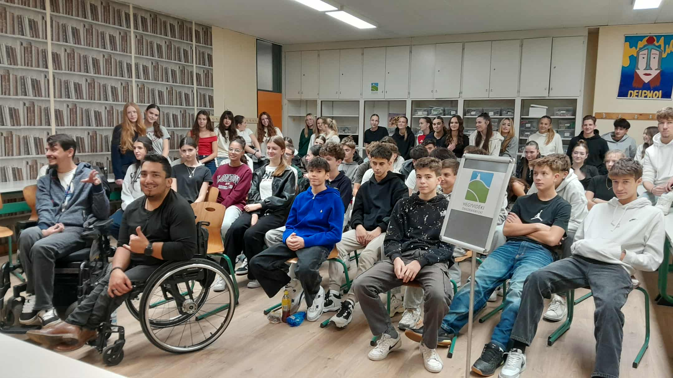 Az érdeklődő diákok két kerekesszékes fiatallal, Báder Richárddal és Tóth Károllyal találkozhattak, akik a Nyomik című dokumentumfilmet hozták el iskolánkba. A film négy fogyatékkal élő fiatalember balatoni nyaralását meséli el, egészen az utazás szervezésének nehézségeitől a pecázáson át a strandon szerzett élményekig. Könnyedén, sok humorral beszél a témáról, de bőven akadnak benne elgondolkodtató részek is. A vetítés után a diákok beszélgettek a filmről, a forgatásról, de kérdezhették a vendégeket a mindennapjaikról, munkájukról, magánéletükről is. A szemléletformáló program sikeres volt, mindenki számára meglepő és példaértékű volt Karcsi és Ricsi optimizmusa, energiája és humora.